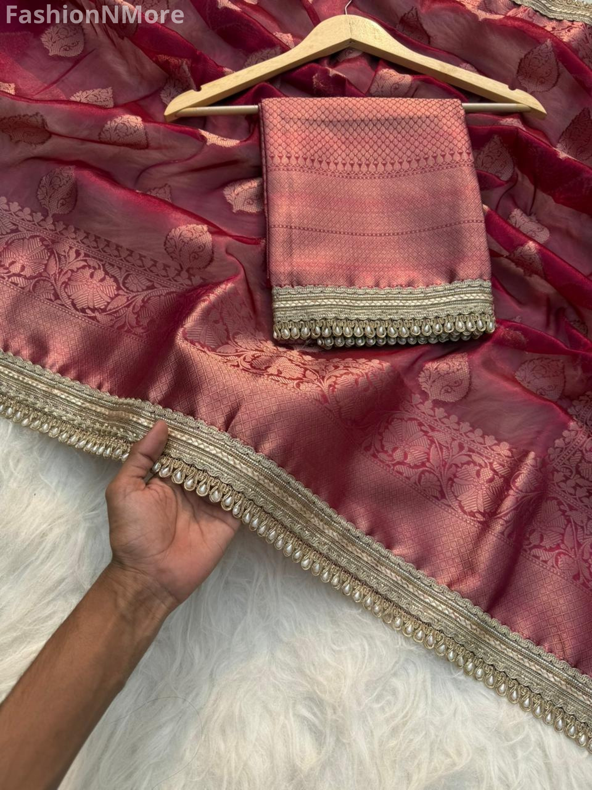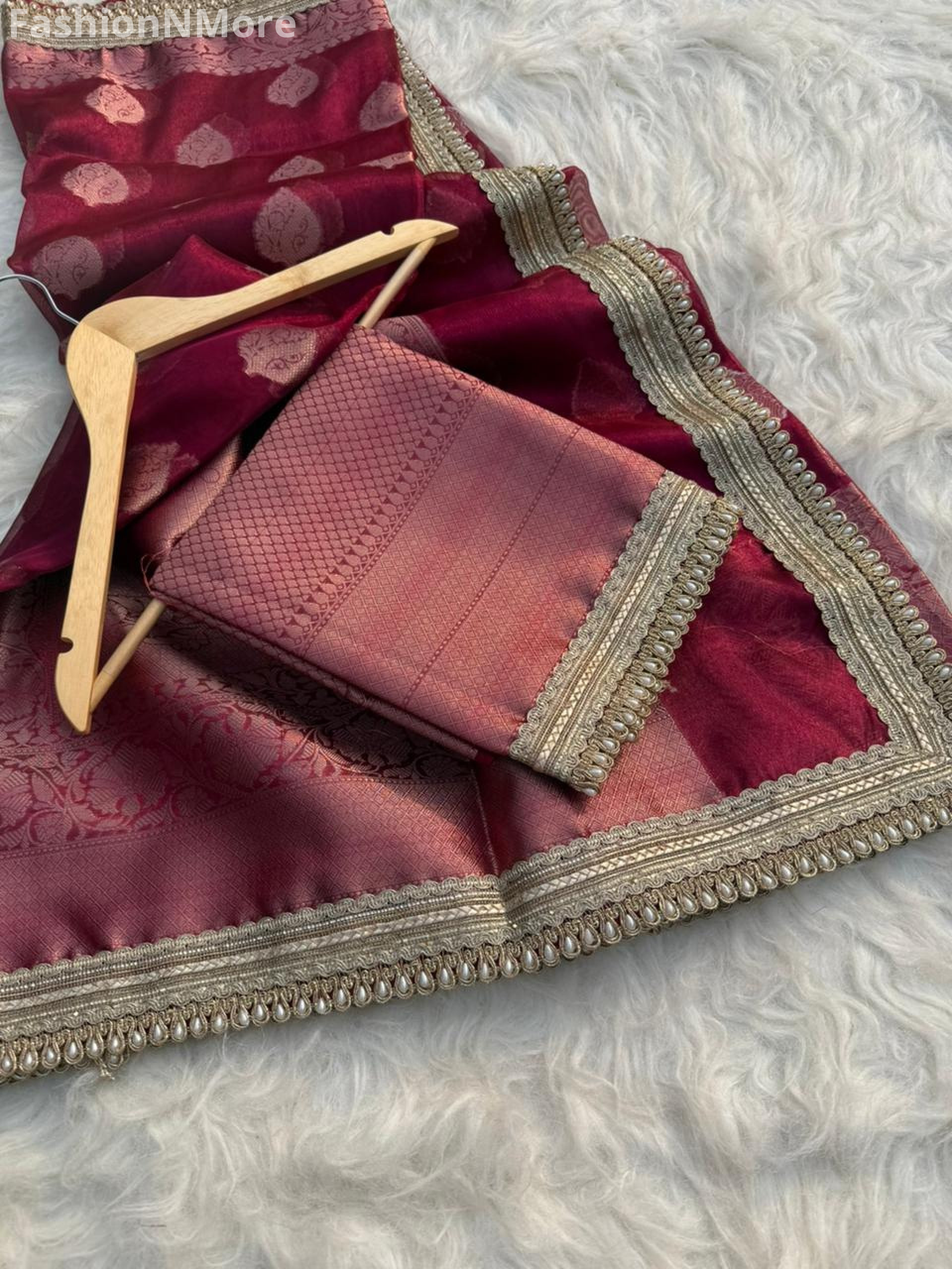 ✔ Comes with a matching brocade blouse with attached lace (unstitched)