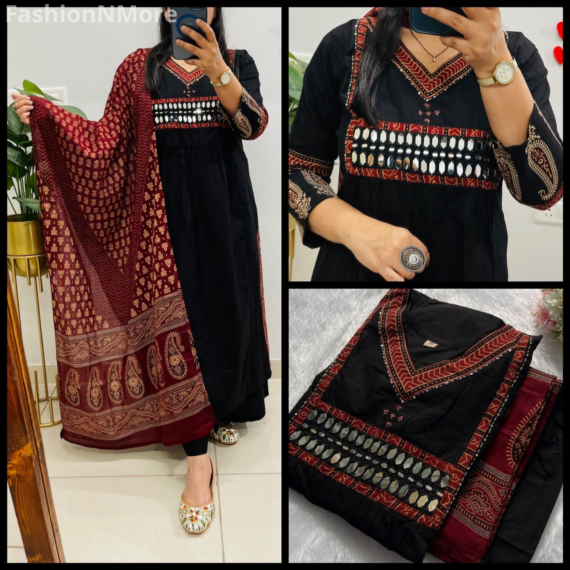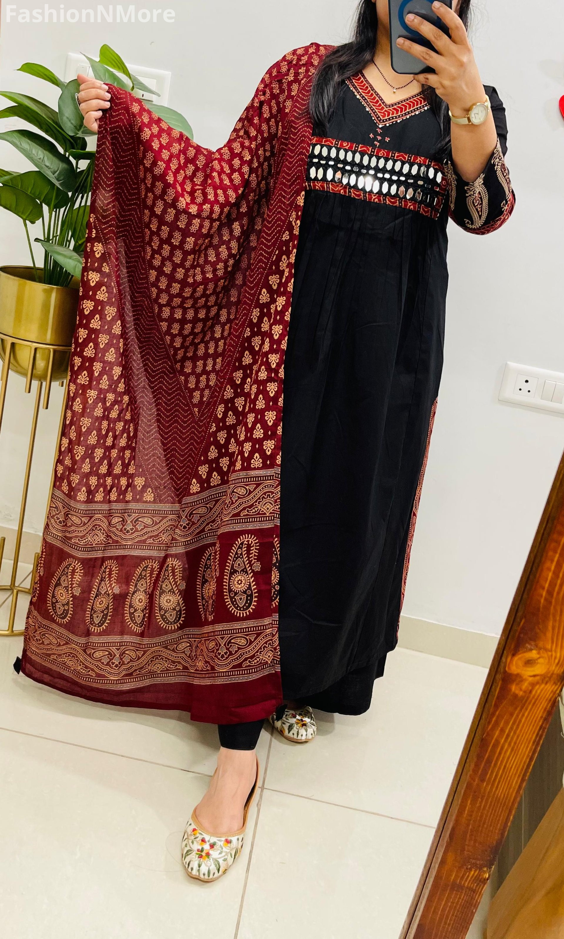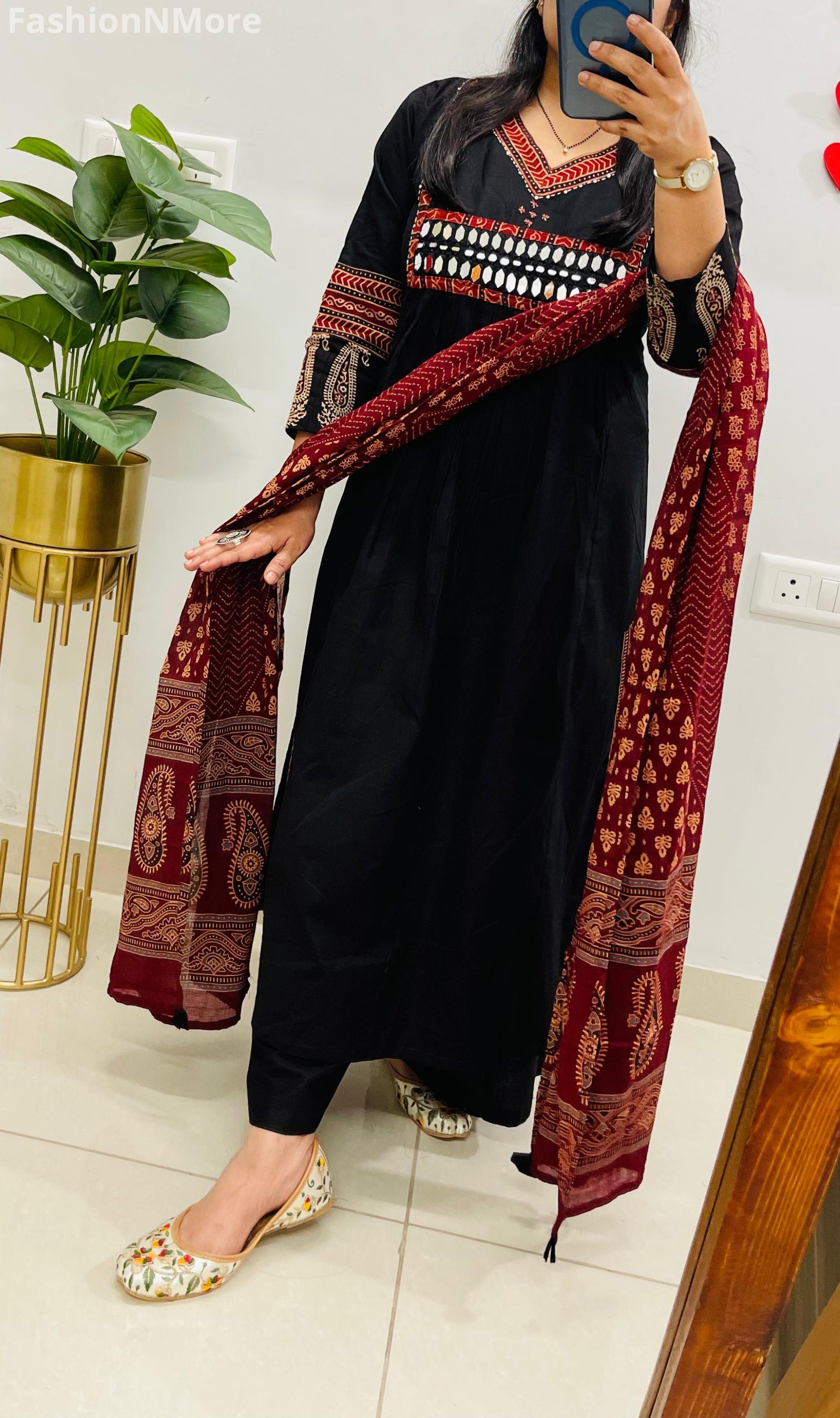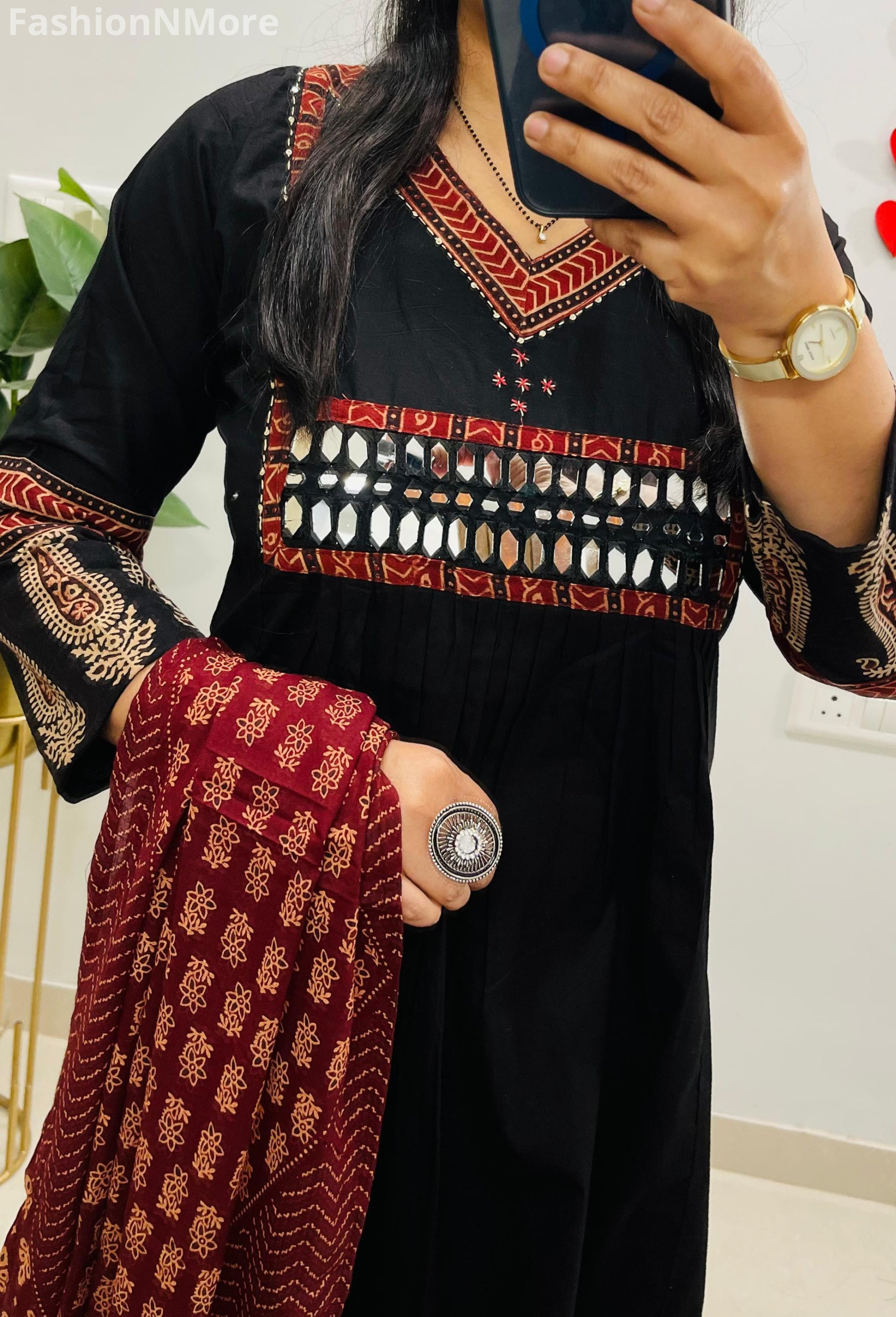 ✔️ Beautiful Ajrakh and mirror applique detailing on the yoke