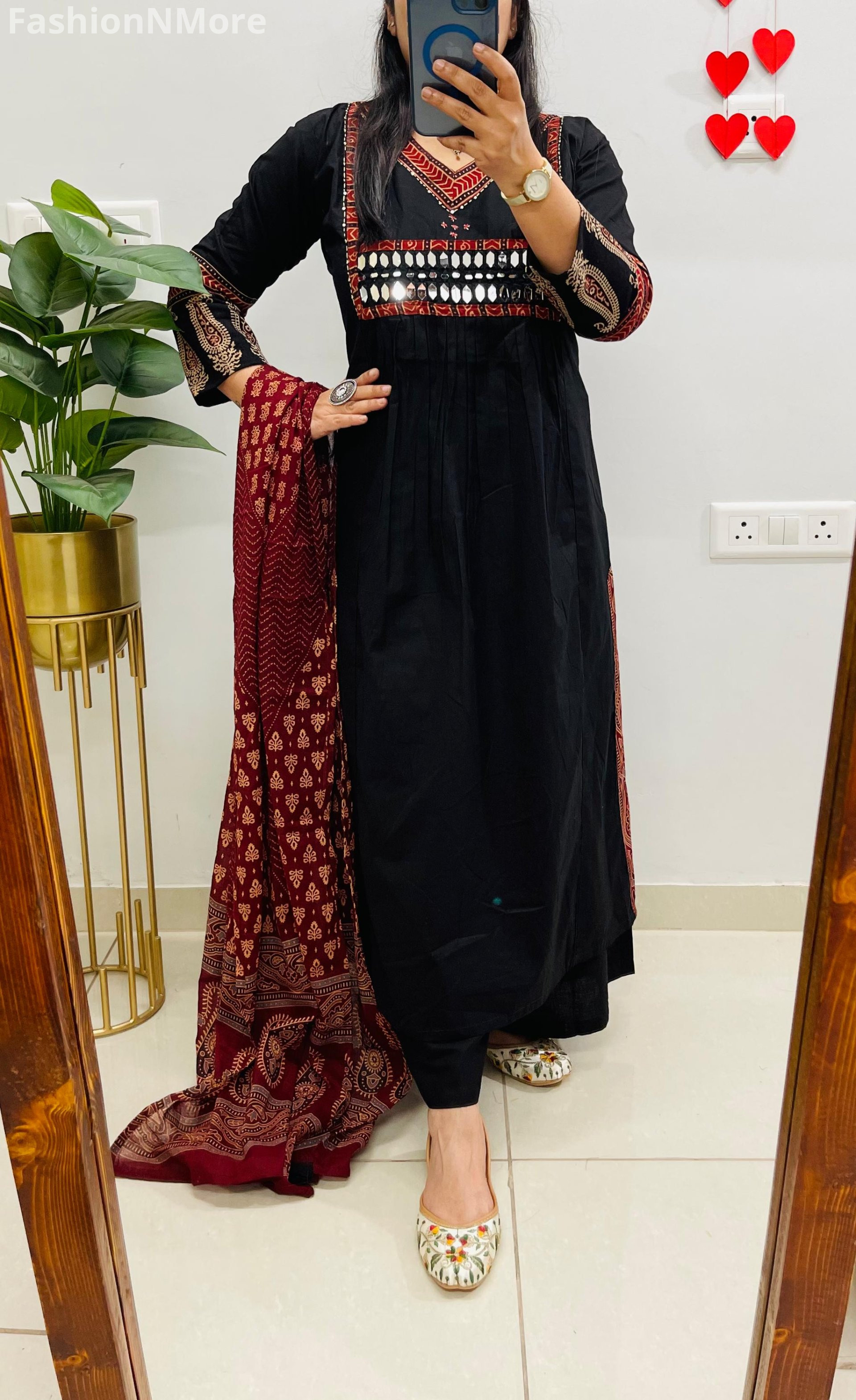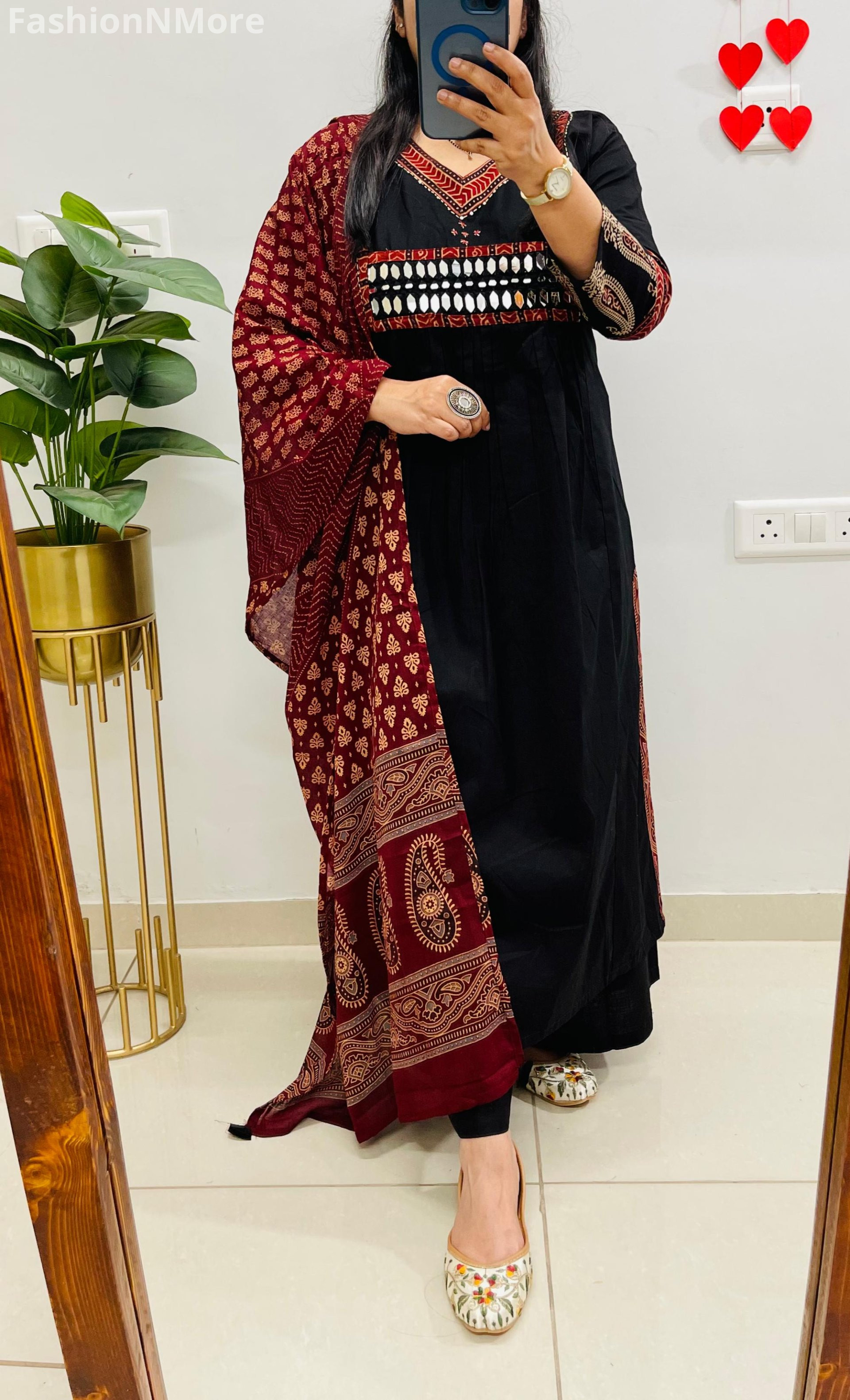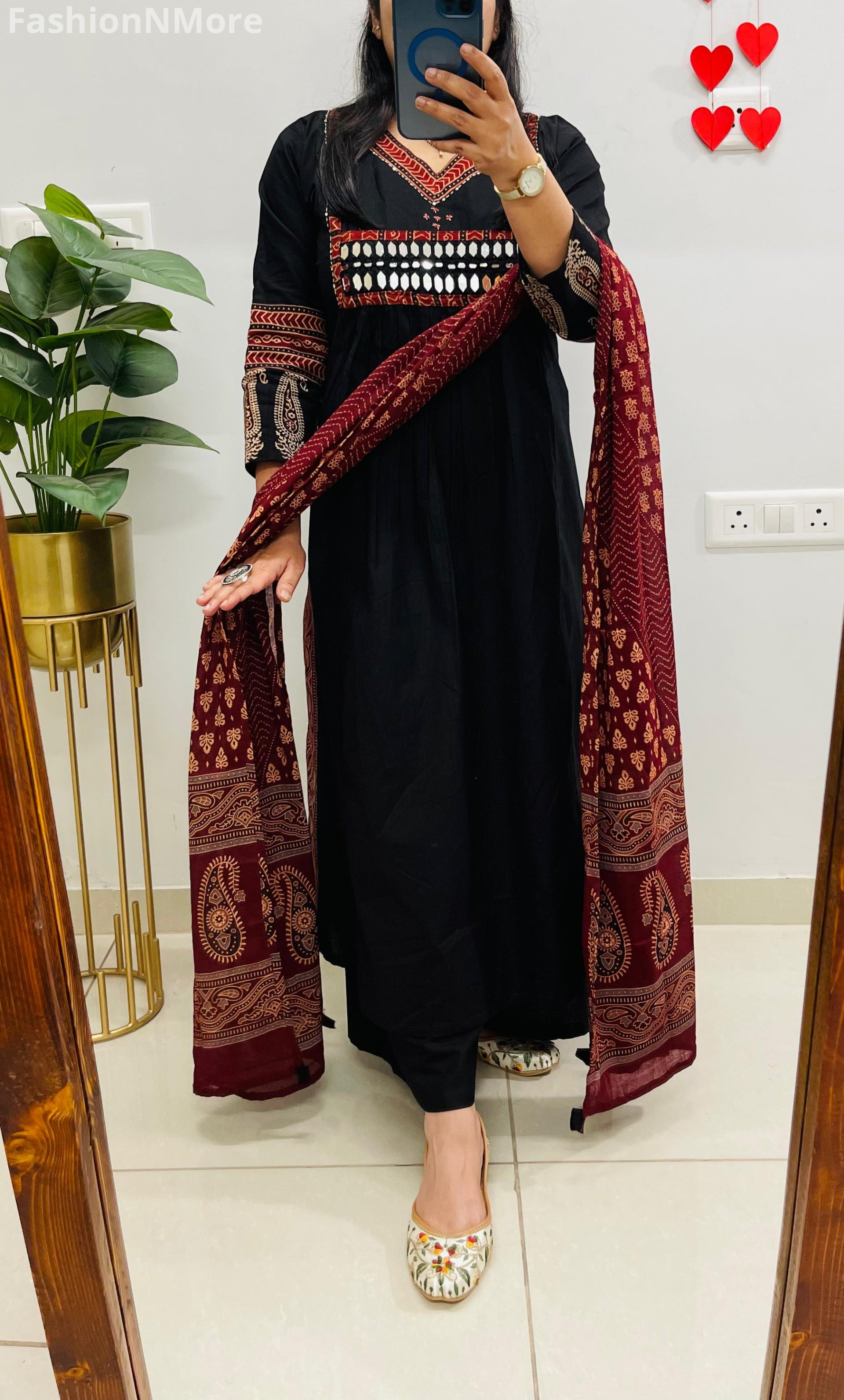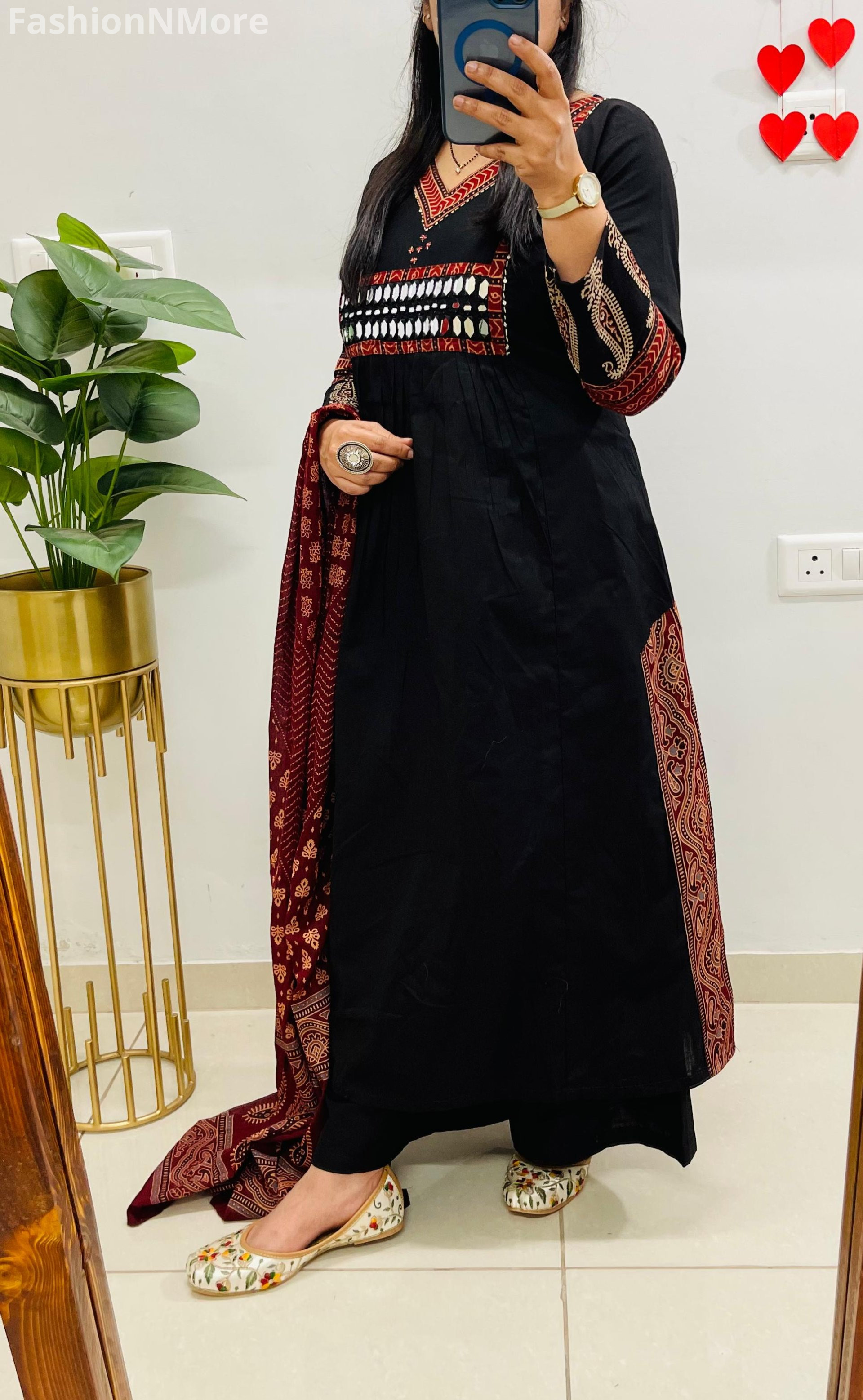 ✔️ Beautiful Ajrakh and mirror applique detailing on the yoke