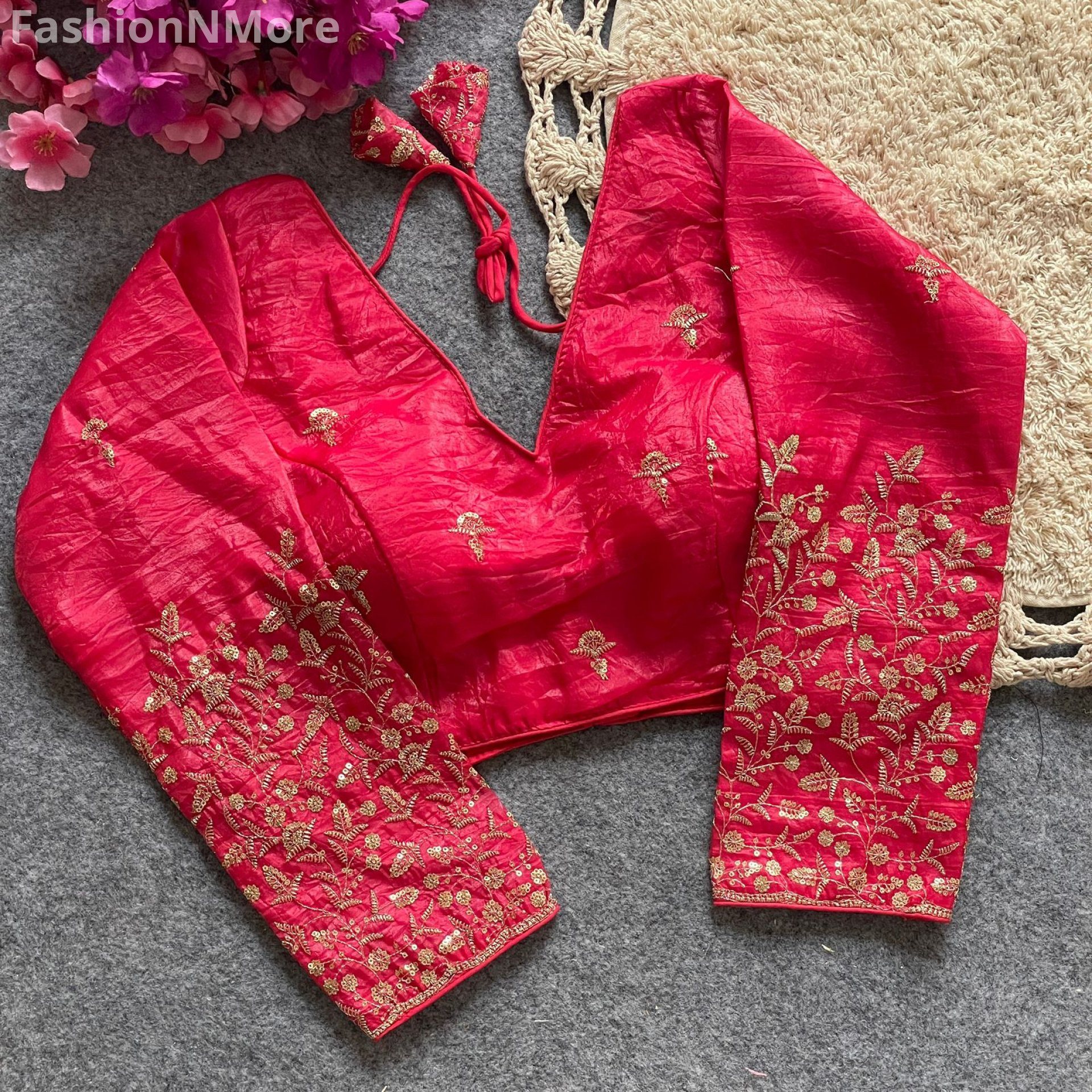 ✔️ Elegant golden embroidery with sequin work all over the blouse