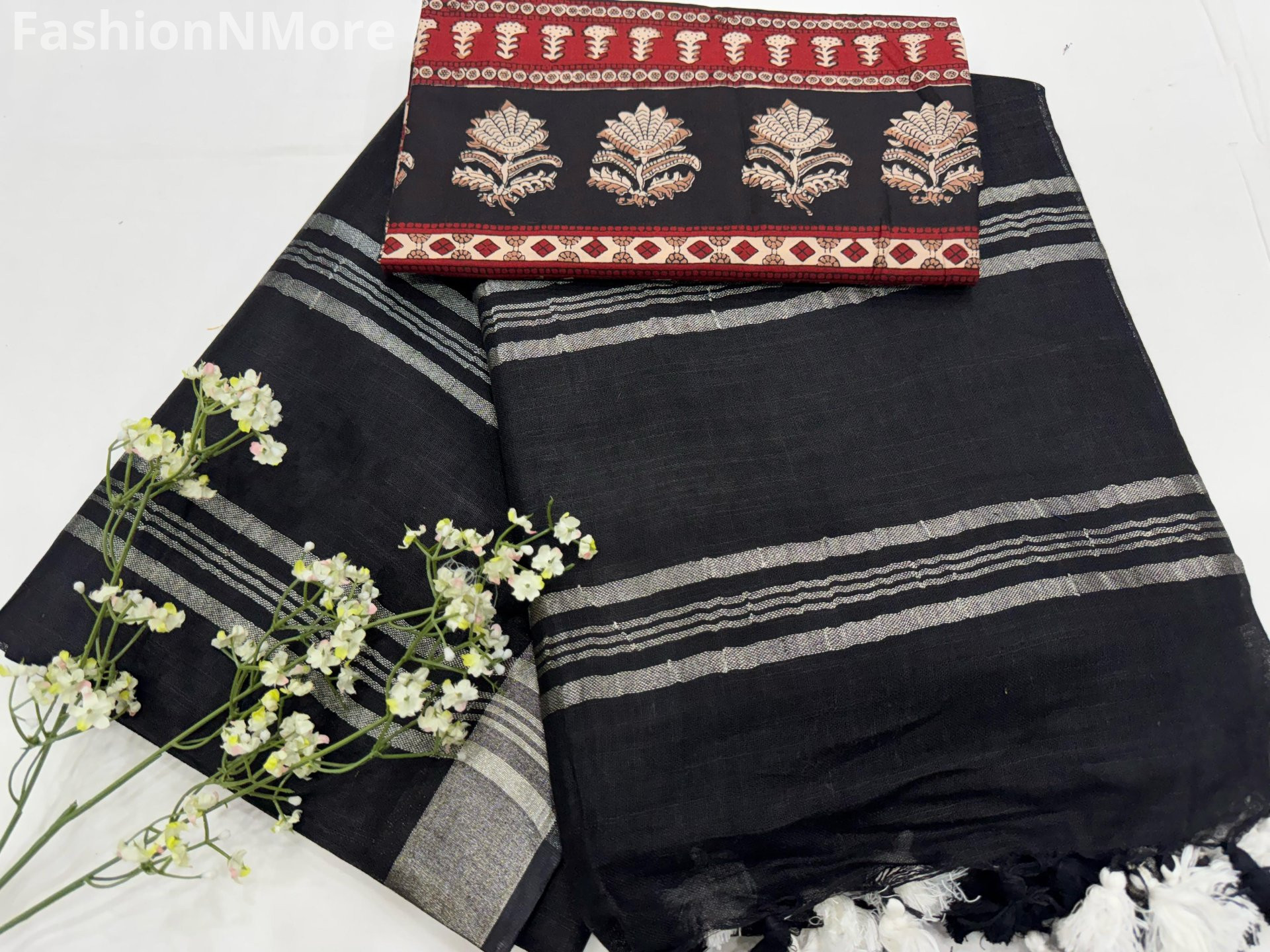 Handloom Cotton Linen Saree with Printed Cotton Blouse