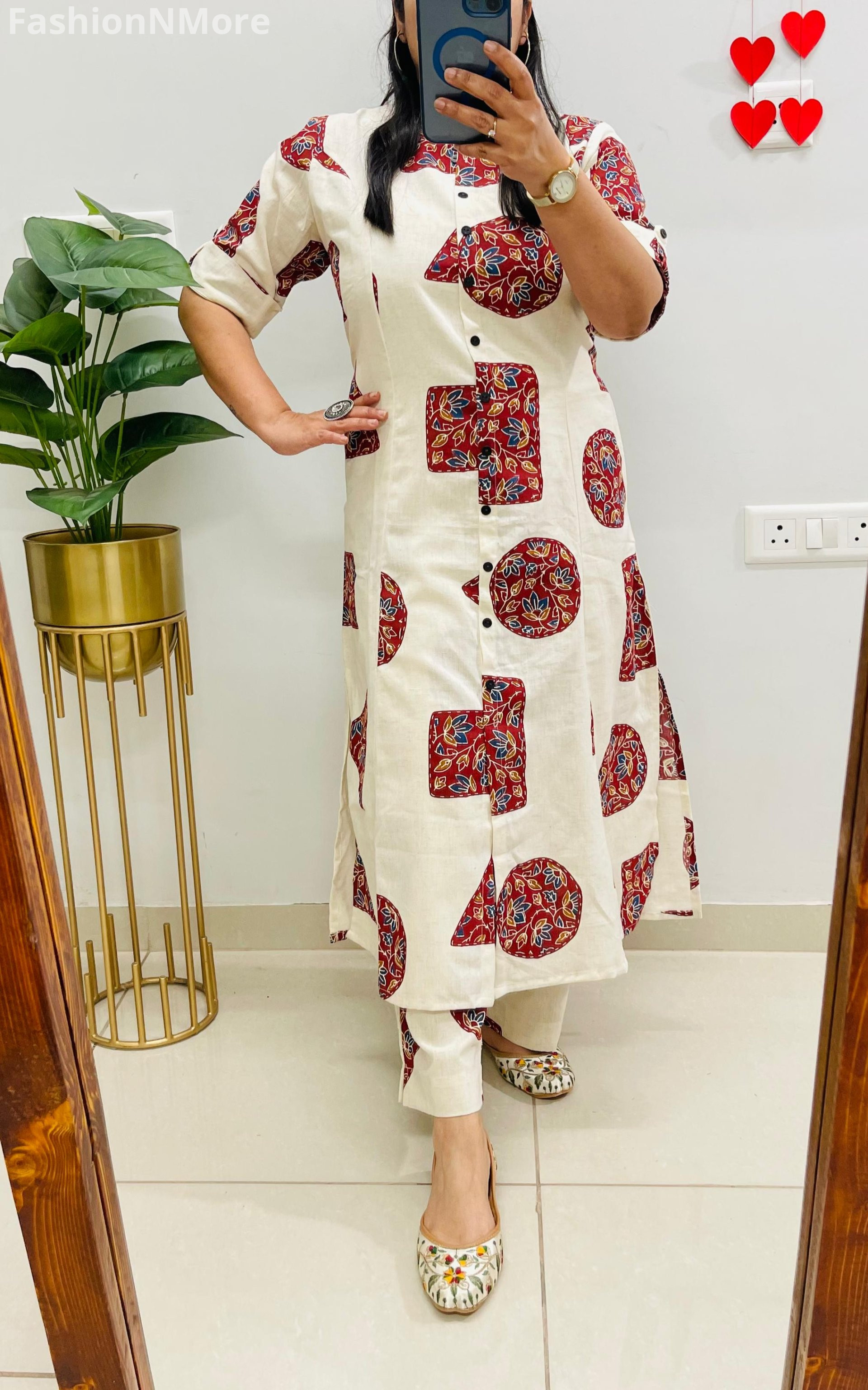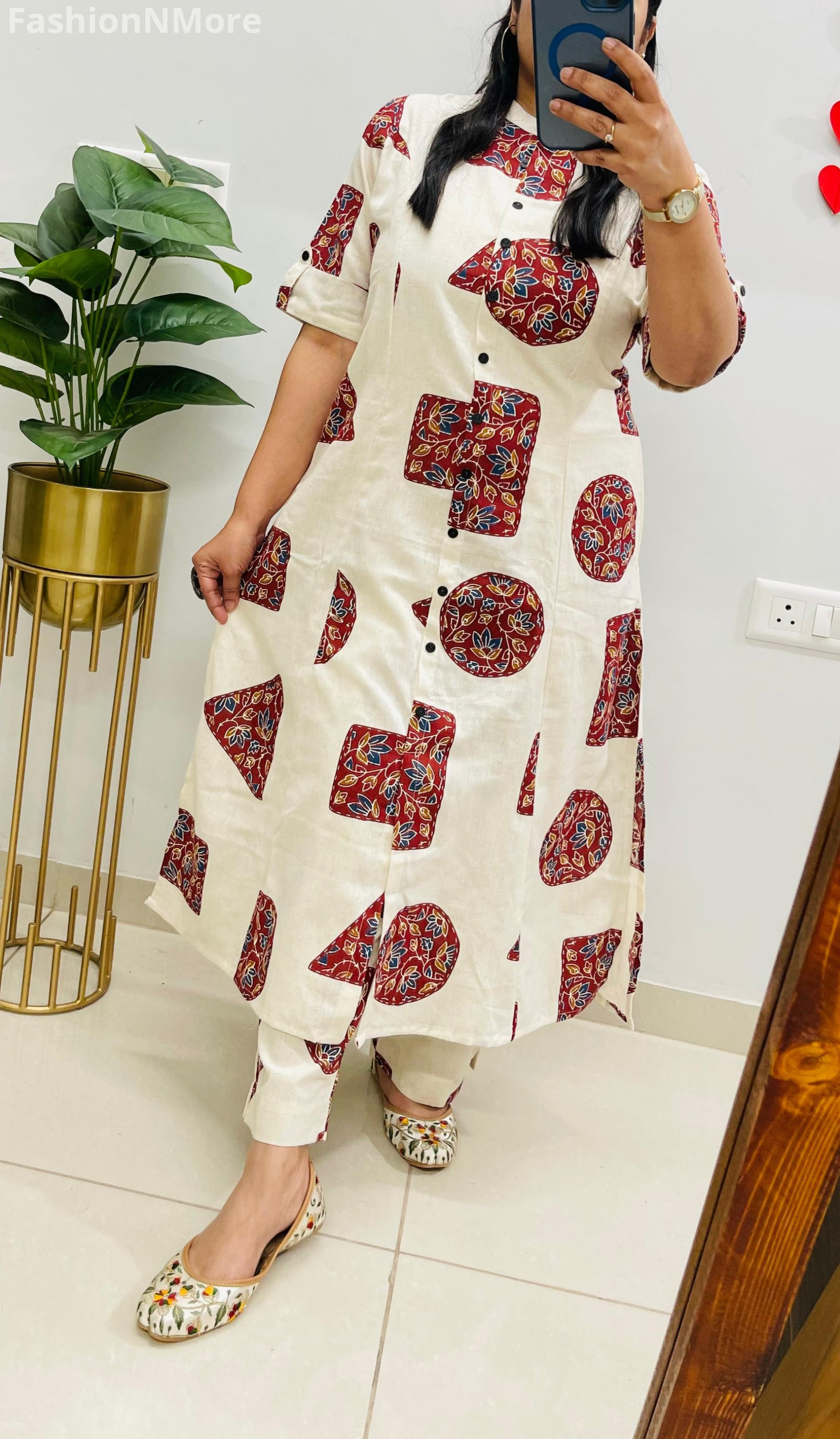 ✔ Elegant A-line kurti pattern paired with matching pants