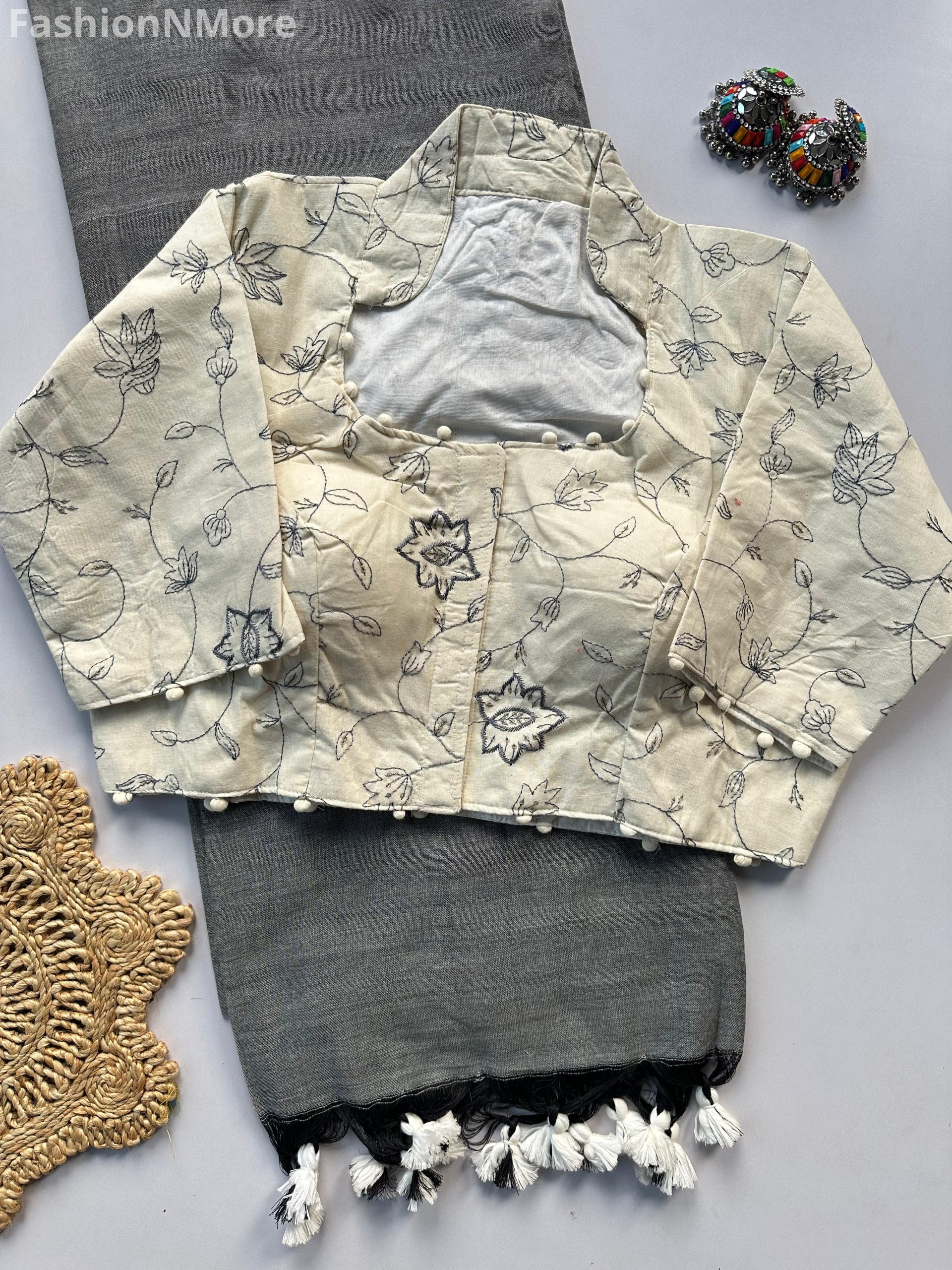 ✔ Comes with a heavy khadi cotton blouse featuring beautiful work