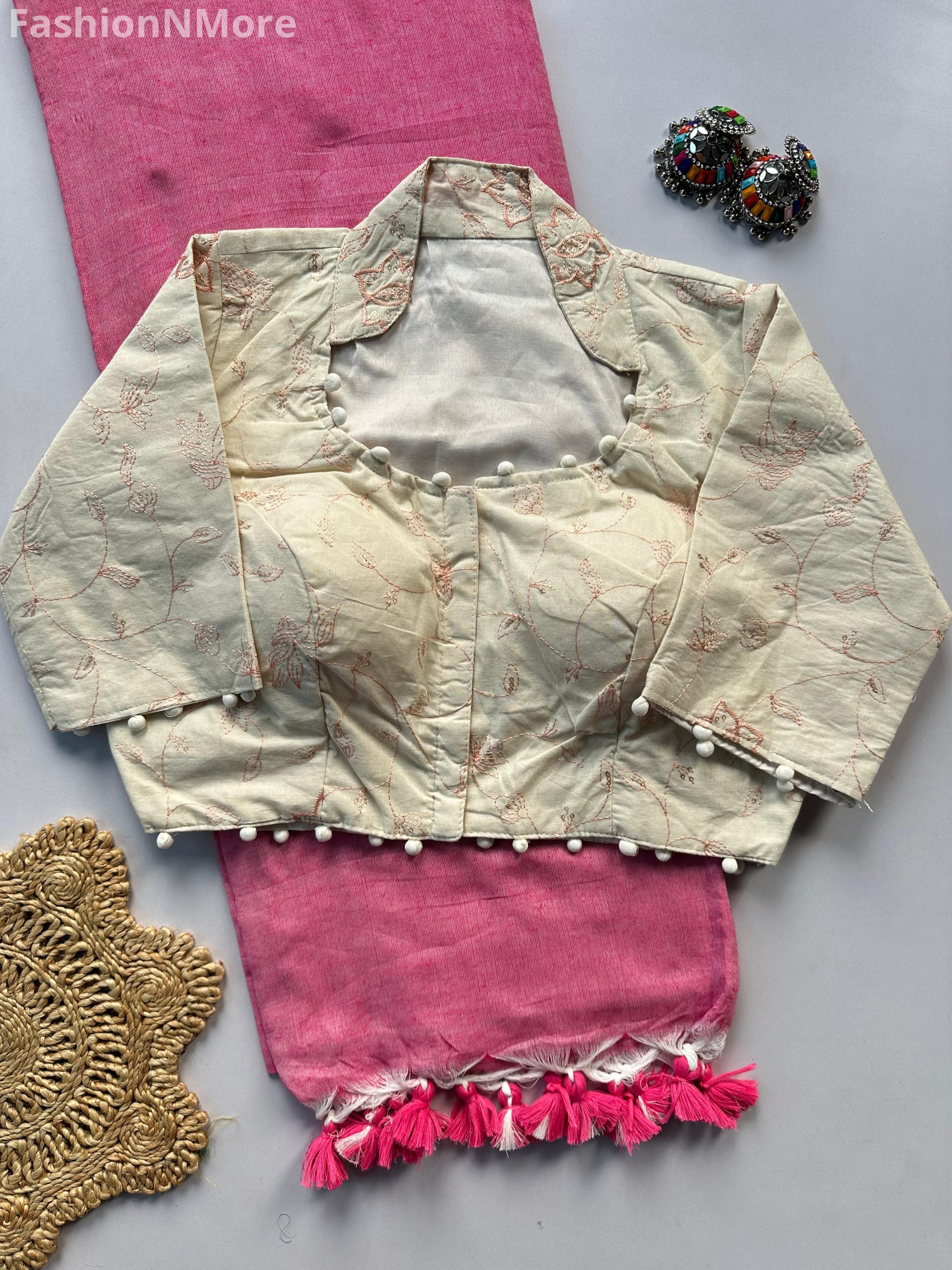 ✔ Comes with a heavy khadi cotton blouse featuring beautiful work