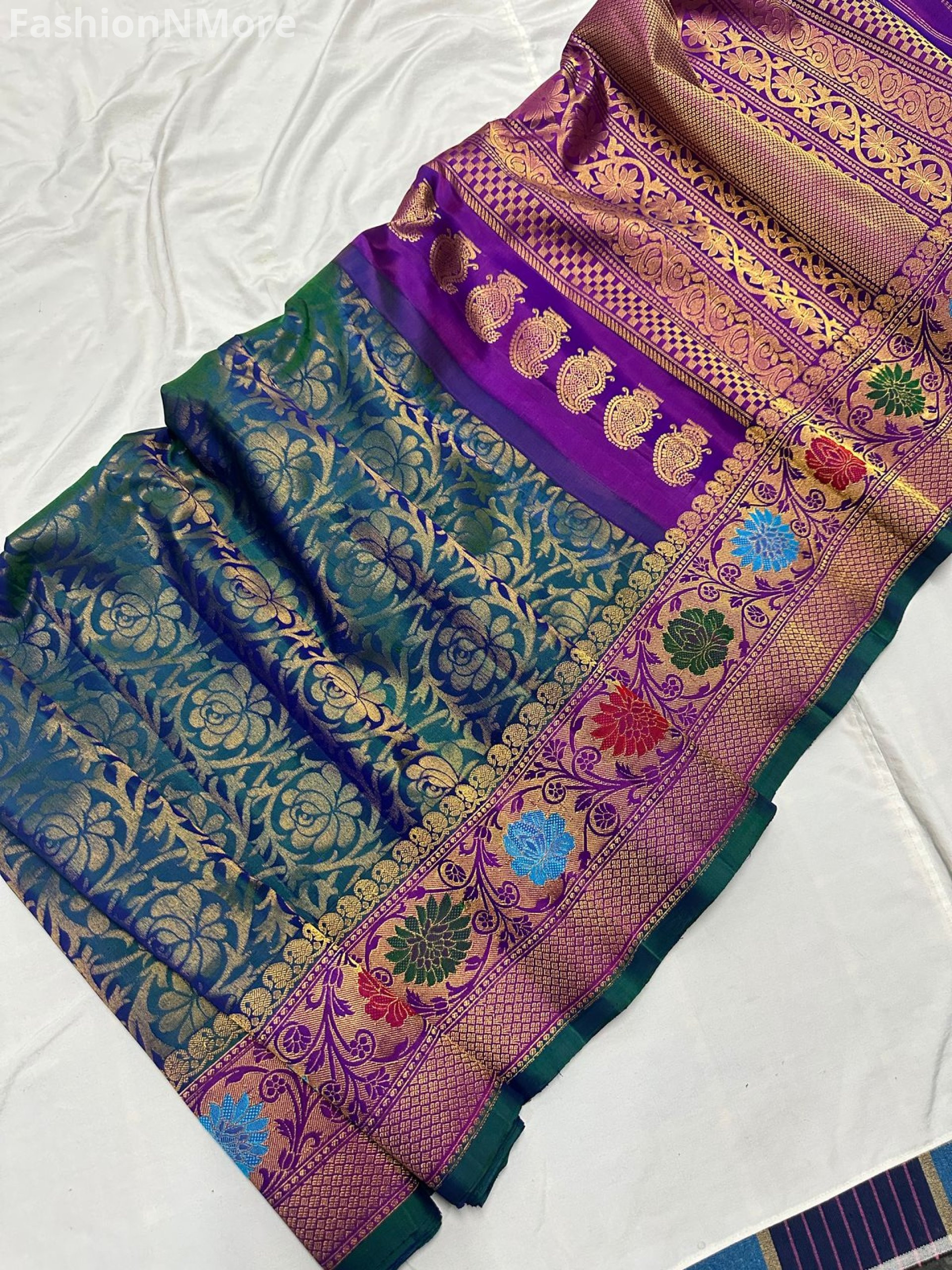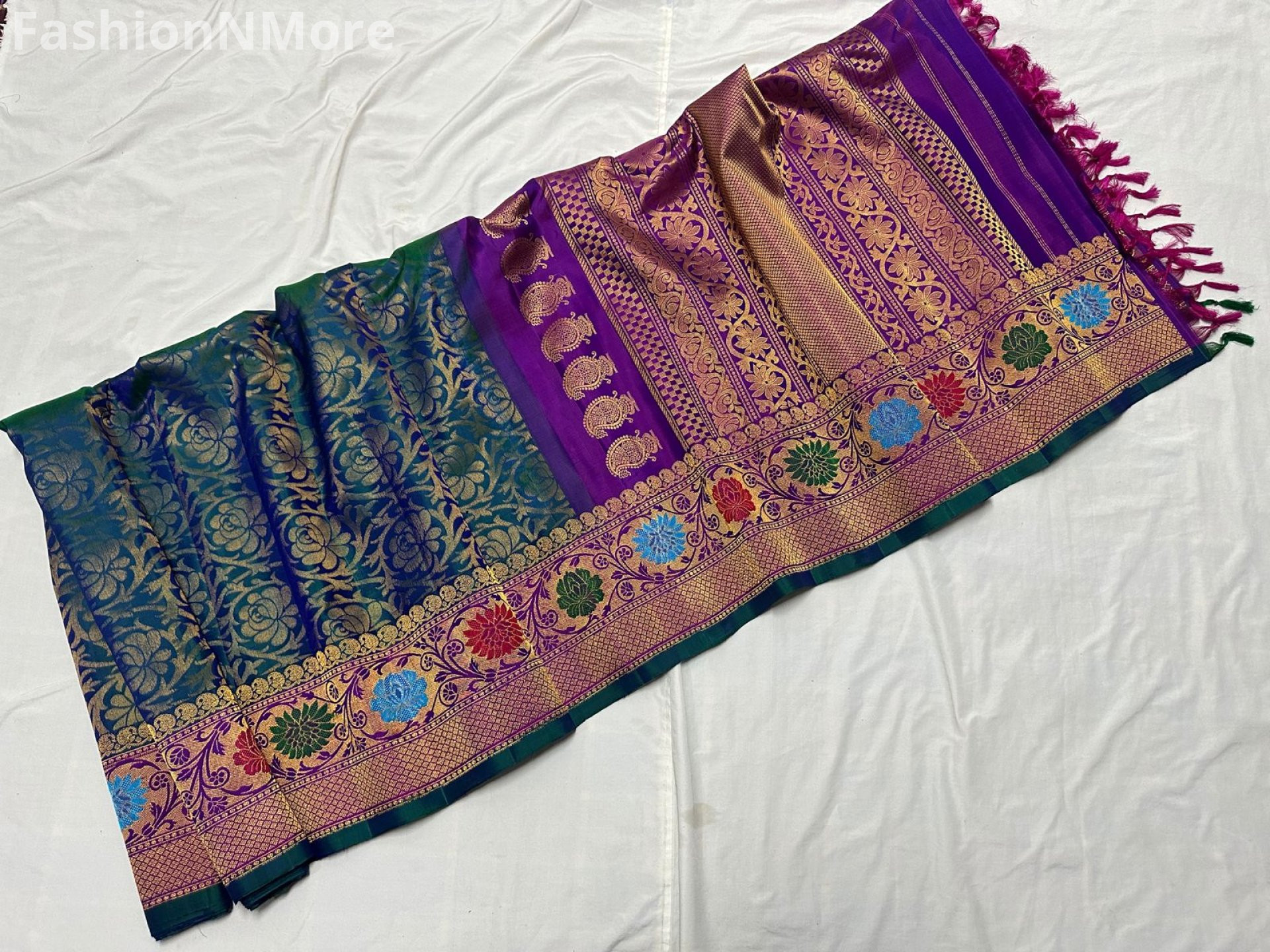 Experience the elegance of Pure Silk Gadwal Handloom Sarees, crafted with intricate Meenakari Turing Borders and luxurious brocade weaving.