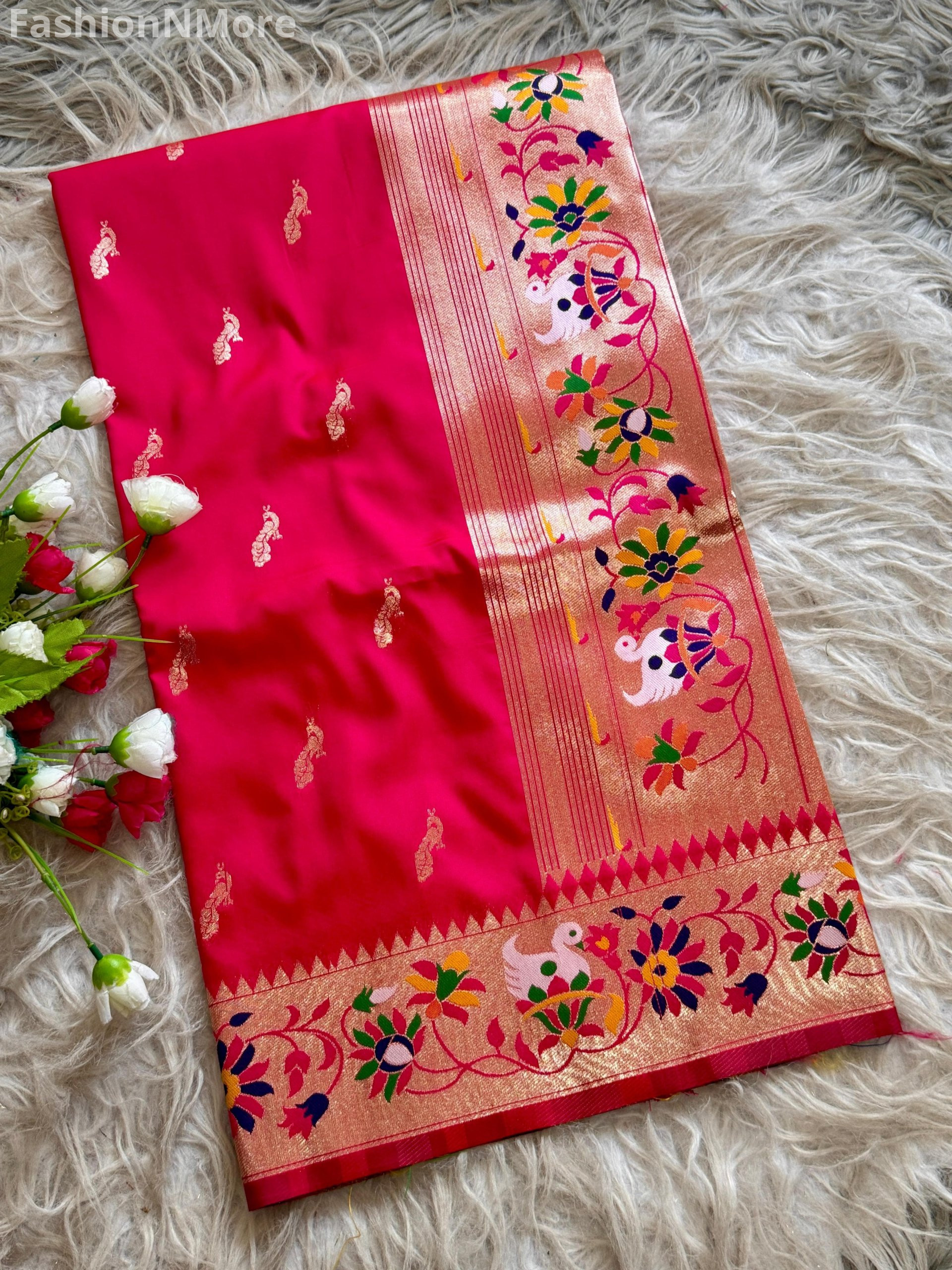 ✔ Traditional Paithani border crafted in rich zari with Rajhans, lotus & floral motifs